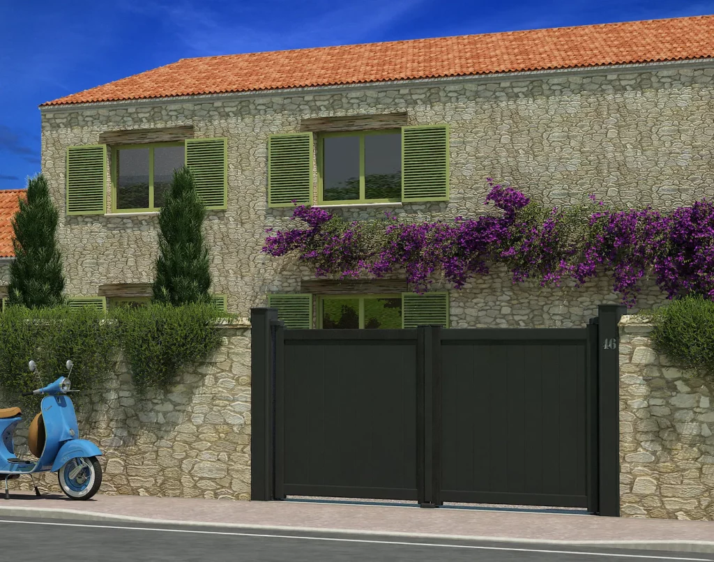 Un indémodable qui ne perd pas de son charme ! Avec le portail Eben, aucune chance de se tromper. Ce portail s’adapte à tous les styles d’extérieurs et répondra aux attentes les plus exigeantes. Ses lames de 150 mm vous assureront sécurité et intimité afin que vous puissiez profiter pleinement de votre havre de paix.