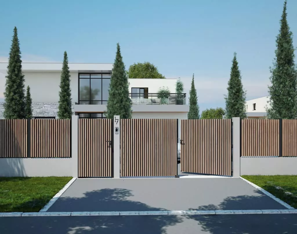 Fabriqué à partir de tasseaux en Red Cedar de 38 x 38 mm et doté d’un KOSre en aluminium avec tôle d’occultation, ce nouveau portail s’adapte à vos préférences. La variation d’espacement entre les tasseaux et le panneau d’occultation vous permet de personnaliser à la fois l’intimité et le design de votre entrée. Le cèdre rouge, matériau robuste, résiste aux conditions météorologiques et reste exempt de déformations liées à la chaleur, faisant de ce bois un choix de référence pour l’aménagement extérieur.