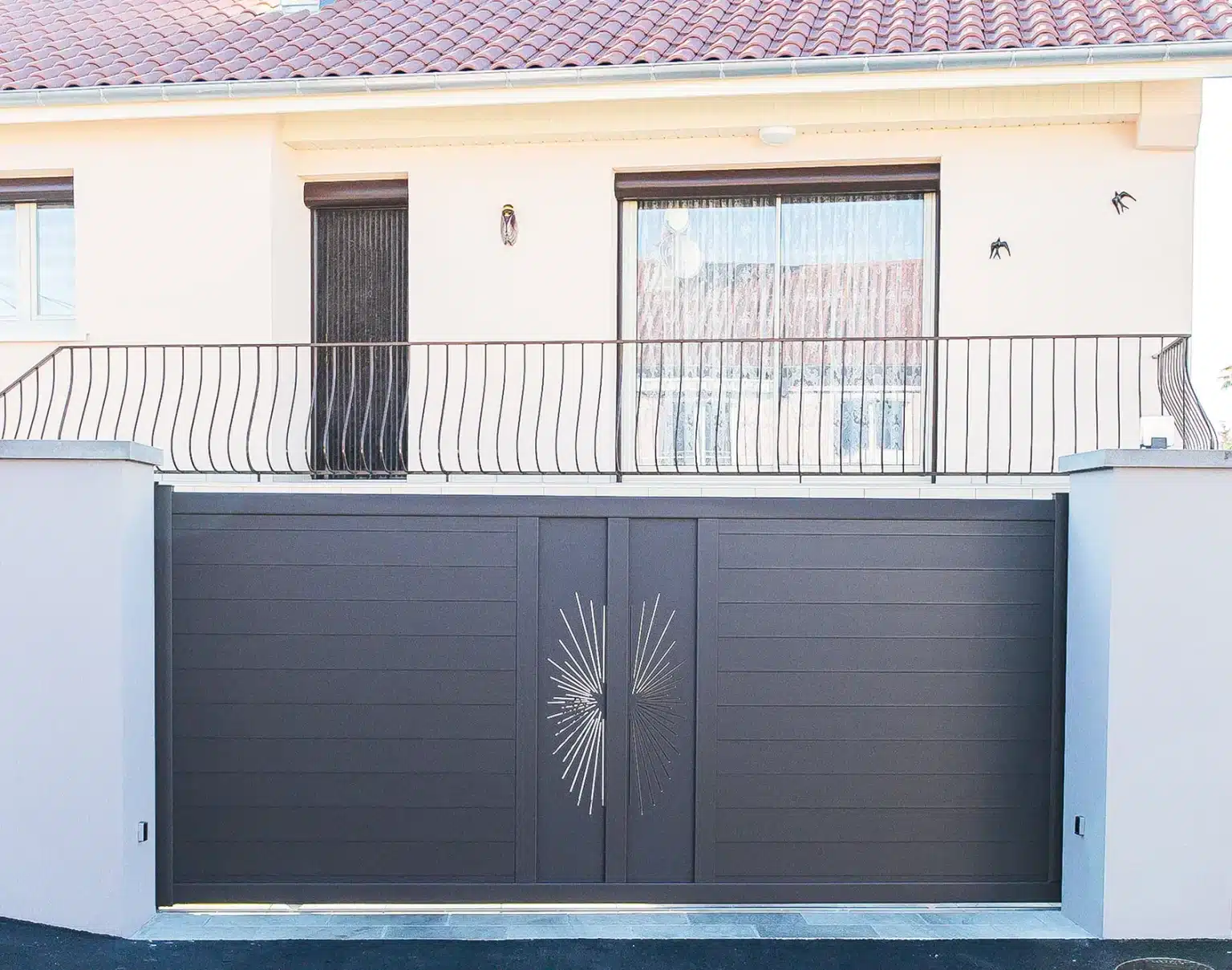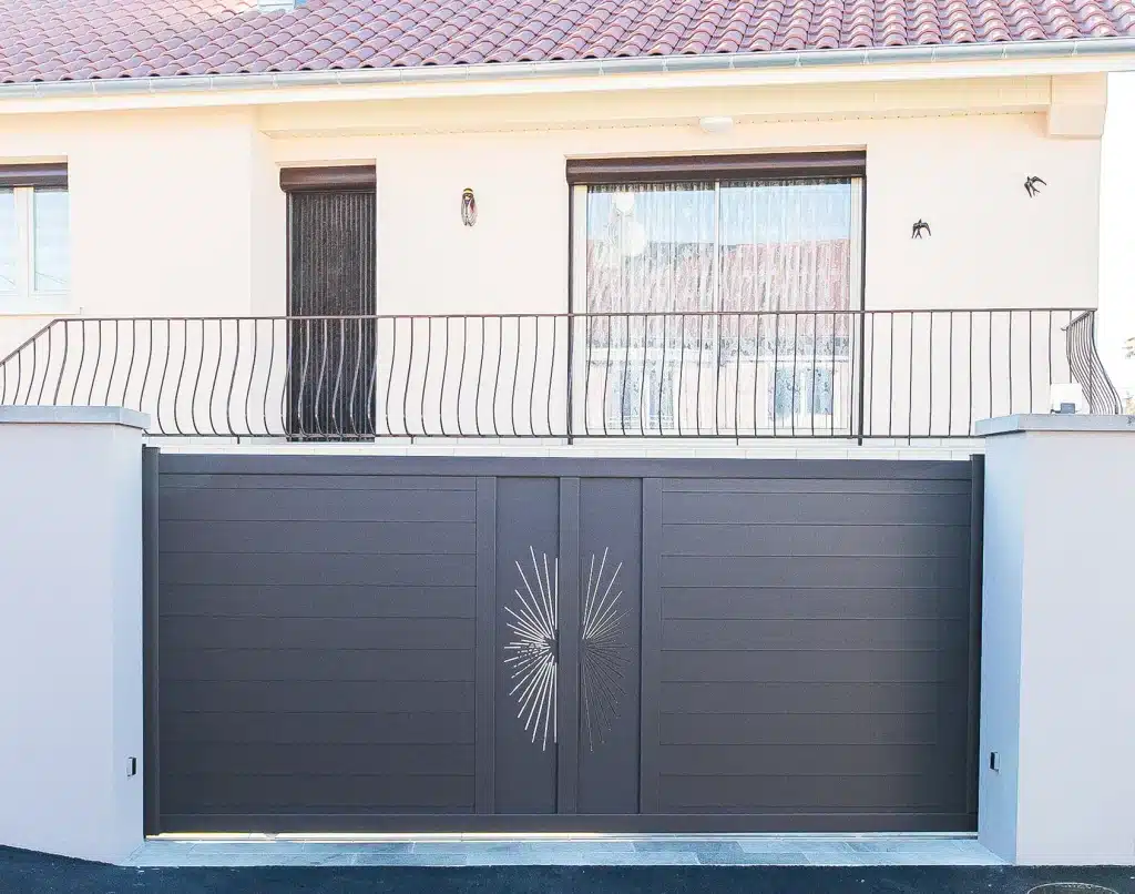 Tel un bijou, le portail en aluminium Soaz accueille en son centre un double décor. Choisissez votre motif parmi 60 modèles et harmonisez votre portail avec votre clôture ou votre habillage de climatiseur. Décors présentés : Soran et Picto.